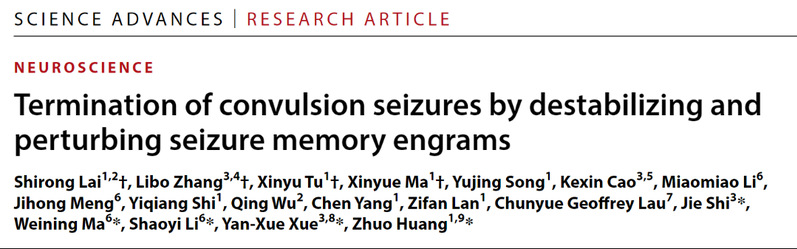 近日,伟德国际1946青年教师赖世荣博士(第一作者)与北京大学药学院黄卓教授团队的合作论文《Termination of convulsion seizures by destabilizing and perturbing seizure memory engrams》在Science Advances杂志(IF=14.57)发表。