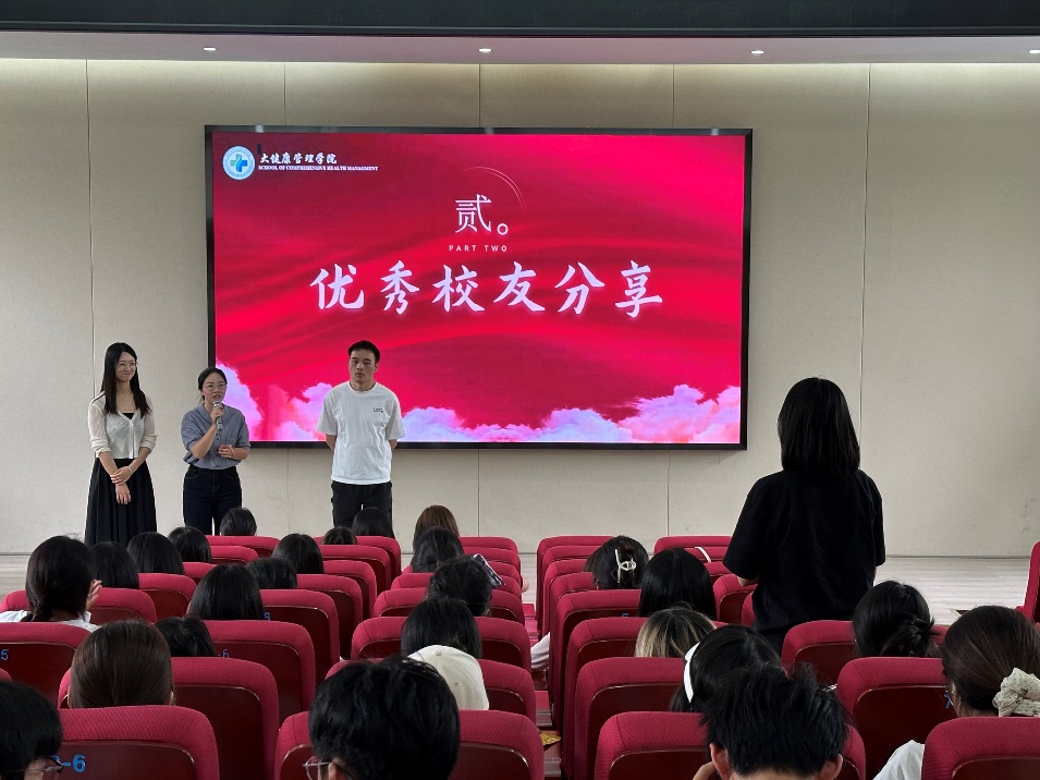 在优秀校友分享环节,程志宝结合自身经历提醒同学们跨考需谨慎,并详细讲解了健康服务与管理专业的学生报考专硕对于获取公卫医师资格证、拓宽未来就业面的重要性。此外,他还建议同学们在本科阶段掌握PPT制作、PS绘图及R语言统计等实用技能,为未来的研究生学习夯实基础。