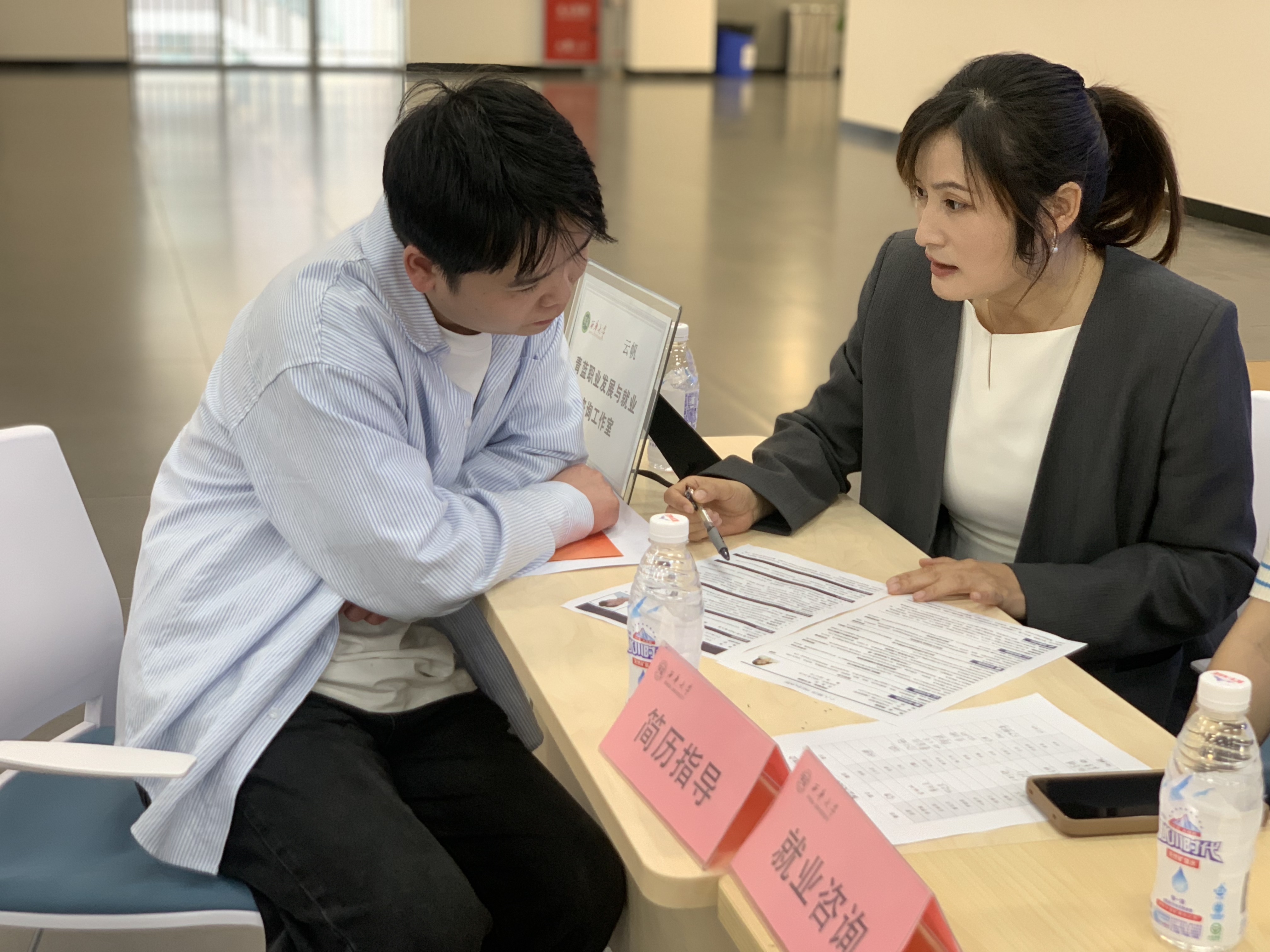 早在招聘会开展一个月前,学院便精心筹备,组建校园招聘大使团队,依托网络渠道与企业进行精准对接,充分发挥学生群体的力量,主动挖掘就业资源。同时,学院领导和老师们积极利用自身积累的行业资源与专业优势,主动联络企业,诚挚邀请其参与双选会,为双选会的成功举办奠定了坚实基础。另外,学院“云帆——青蓝职业发展与就业咨询工作室”组织了老师在现场值班,为学生做简历和面试指导和服务。