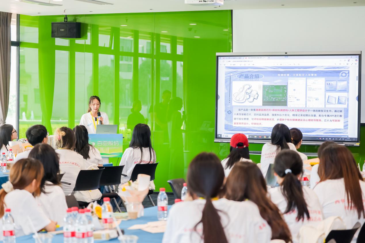 在产学交流环节中,学生代表蒲蕊分享了团队项目“智柔芯”智慧卫生巾的研发进展,引发热烈讨论。同学们就卫生巾的智能化功能——如经期监测、健康数据反馈、材料创新等方向提出设想,与自由点研发团队现场交流。同样,自由点研发团队也与同学们共享了企业在智慧卫生巾研发方面的情况,并为同学们的研究提出专业意见。