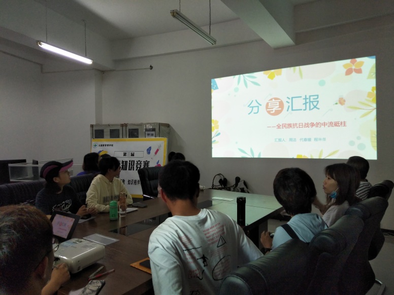 随后,周洁、程琳傑和付元柳三位同志进行了主题为“全民族抗日战争的中流砥柱”的党史知识分享会。分享会包含了抗日战争时间线梳理、抗日战争时期党的方针路线和抗日英雄三部分。在这段历史中,我们看到了全体中华儿女为国家生存而战、为民族复兴而战、为人类正义而战的伟大意志与坚定信念。鉴往事,知来者。作为青年党员,我们应当继承和弘扬伟大抗战精神,以越是艰险越向前的大无畏气概,以压倒一切困难而不为困难所压倒的决心和勇气,敢于斗争,善于创造,锲而不舍为实现中华民族伟大复兴而奋斗,直至取得最后的胜利。