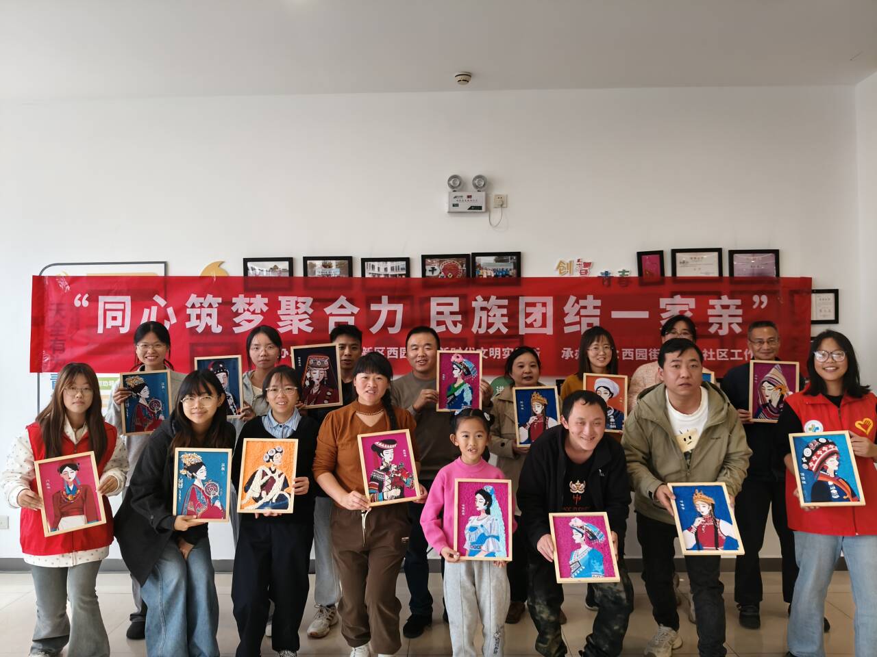 活动的核心环节——民族纸浆画手工实践备受关注。在老师与志愿者的耐心指导下,居民们亲手体验了纸浆画的制作工艺,在一涂一抹、精心点缀中,感受不同民族文化的艺术魅力与深厚底蕴。这不仅是一场手工创作,更是一次沉浸式的民族文化体验。活动最后,全体参与者手持完成的作品合影留念,定格了团结、欢乐的温馨瞬间。