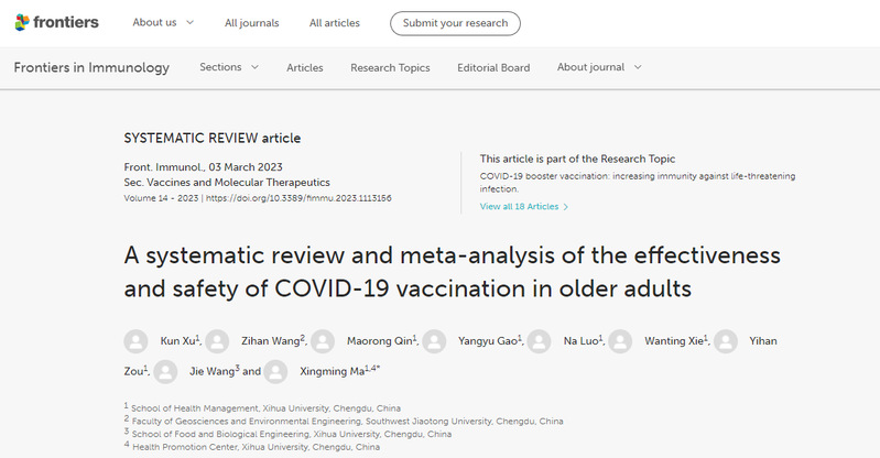 近日,伟德国际1946卫生检验与检疫专业2020级本科生许坤为第一作者、马兴铭教授为通讯作者的论文“A systematic review and meta-analysis of effectiveness and safety of COVID-19 vaccine in older adults”在线发表于免疫学Top期刊《Frontiers in Immunology》(JCR Q1区,IF=8.786)。